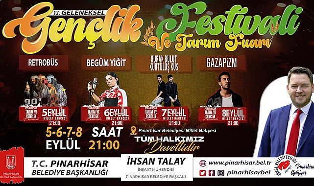 Pınarhisar Belediye Başkanı İhsan Talay, “milli birlik ve beraberliğimizi coşku ve heyecanla pekiştirmek için sizleri 5-8 Eylül tarihleri arasında düzenleyeceğimiz Gençlik Festivali ve Tarım Fuarı’mıza davet ediyoruz. Gelin, hep birlikte bu özel anları paylaşalım!” dedi. Pınarhisar Belediyesi gerçekleşecek olan programın gün ve saatlerini paylaştı.Festival Programı:-Tarım Fuarı Açılışı: 4 Eylül Çarşamba, Saat 12.00-İsmet Çakmak By Ghost Drummer Perküsyon Show: 5 Eylül Perşembe, Saat 20.00-Retrobüs Konseri: 5 Eylül Perşembe, Saat 21.00-Begüm Yiğit Konseri: 6 Eylül Cuma, Saat 21.00-Dj Emrullah: 7 Eylül Cumartesi, 20.00-Burak Bulut & Kurtuluş Kuş Konseri: 7 Eylül Cumartesi, Saat 21.00-Dj Emrullah: 8 Eylül Cumartesi, 20.00-Gazapizm Konseri: 8 Eylül Pazar, Saat 21.00Haber Merkezi