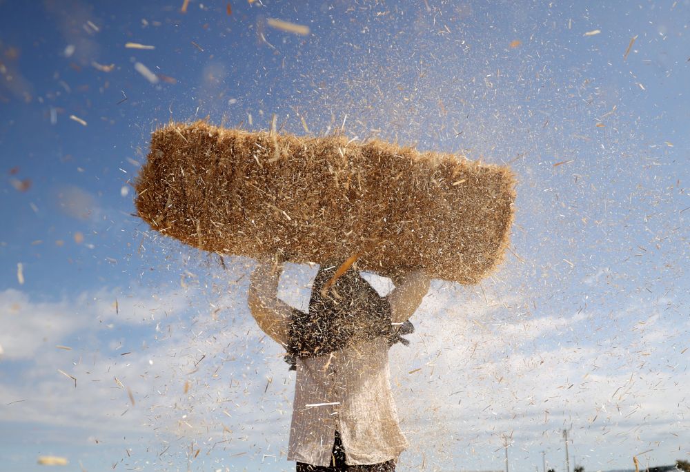 İşçiler, yerden omuzlayarak kaldırdıkları yaklaşık 40 kilogramlık balyaları römorklara yüklüyor.