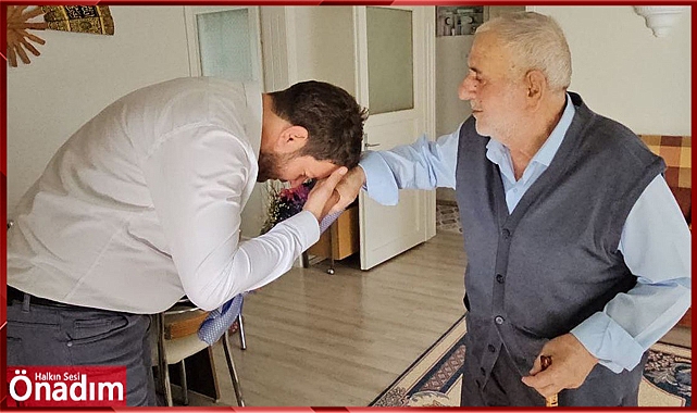 Elini öpüp şehit babasına çiçek takdim eden Başkan Talay, “Evlatları için ‘Vatan sağ olsun’ diyen Şehit Murat Koç'un babası Ahmet Koç'u ve Şehit Şeref Avar'ın babası İsmail Avar'ı ve ailelerini ziyaret ettik.