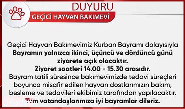 Kırklareli Belediyesi Geçici Hayvan Bakım Evinin bayramda ziyarete açık olacağını duyurdu. Bayramın yalnızca ikinci üçüncü ve dördüncü günü ziyarete açık olacak geçici hayvan bakım evinde ziyaret saatleri 14.00 ile 15.30 arasında olacak bayram tatili devam ederken tedavi gören ve misafir edilen hayvan dostlarımızın bakımı ve beslenme tedavileri ise Kırklareli Belediyesi ekipleri tarafından devam ettirilecek.