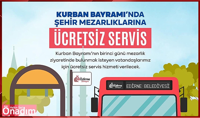 Edirne Belediyesi Kurban Bayramı’nın 1. gününde ücretsiz Servis hizmeti sağlaycağını duyurdu.Edine Belediye Başkanlığı Bayram’ın 1. günü ücretsiz servis hizmeti sağlayacağını sosyal medya hesabından şu ifadeler ile duyurdu;“Belediyemizin Ulaşım Müdürlüğü tarafından Kurban Bayramı’nın 1.günü (28 Haziran Çarşamba) bayram namazından sonra şehir mezarlıklarına gitmek isteyen vatandaşlarımız için Eski Camii karışındaki otobüs durağından Yenişehir, Buçuktepe, Karaağaç, Yeniimaret-Bademlik, Yıldırım ve Acıçeşme Mezarlıklarına ücretsiz otobüs servis hizmeti verilecektir.