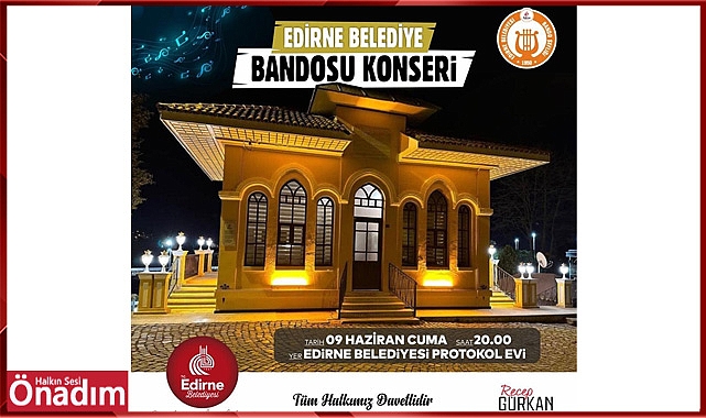 Bölgede büyük bir şöhrete sahip olan edirne Belediye Bandosu yarın gece Edirnelilere özel bir konser verecek. Edirne Belediyesinin organizasyonunda bando ekibi Rumeli ezgileri ve birçok eseri icra edecek. Edirne Belediyesinden yapılan açıklamada, “Edirne Belediye Bandosu’nun Meriç Nehri Protokol Evi’nde vereceği harika konsere sizleri bekliyoruz. Tarih: 09 Haziran Cuma Saat: 20.00 Yer: Edirne Belediyesi Protokol Evi” denildi.