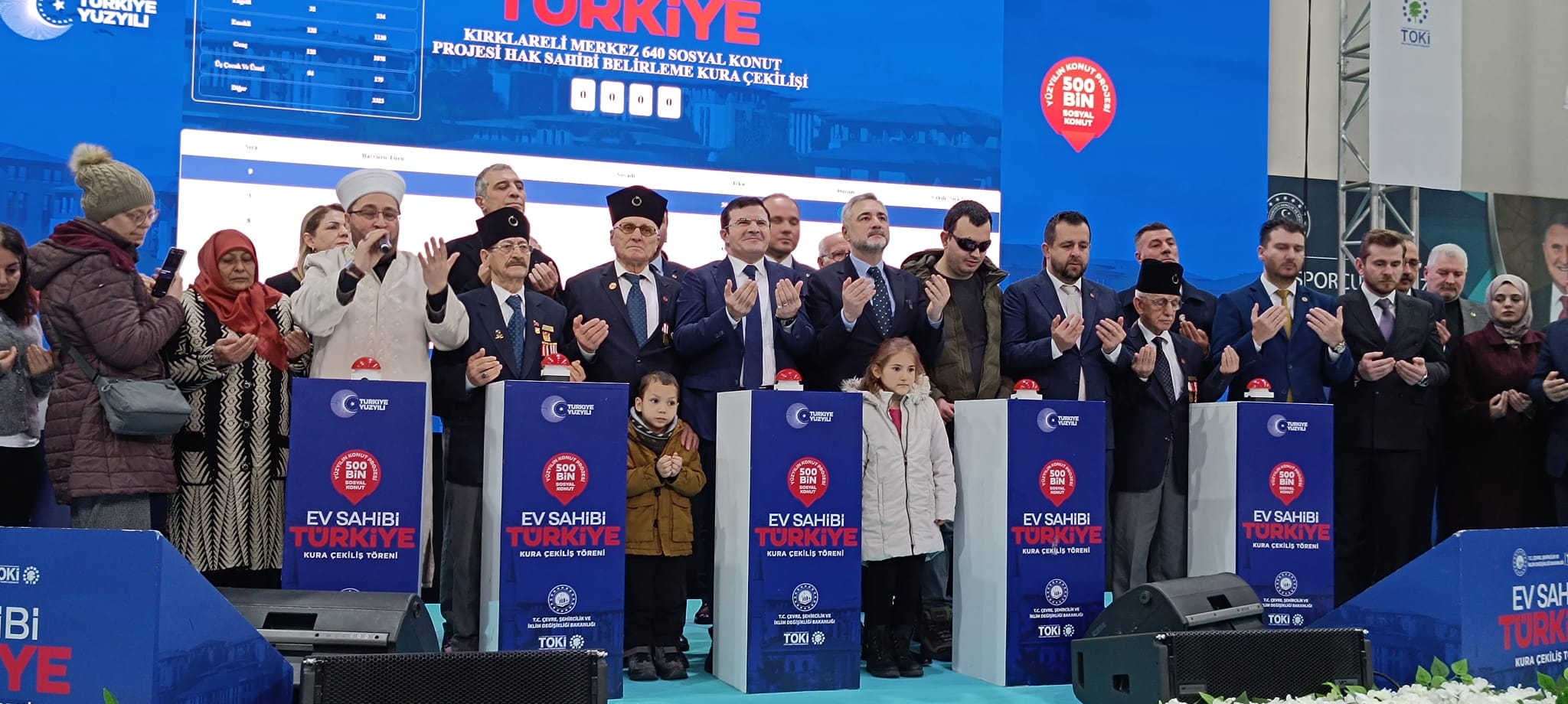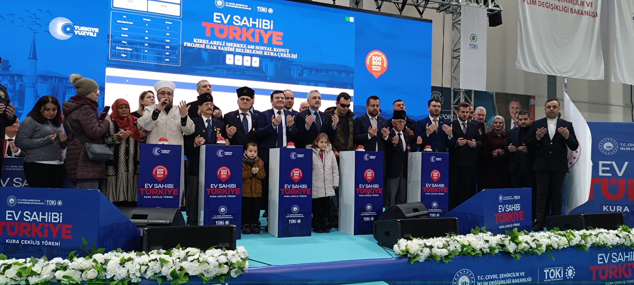 Program, Mustafa Eviş tarafından okunan dua ile devam etti. Duanın ardından tüm protokol üyeleri sahneye çıkarak dev ekranda Kırklareli TOKİ kura çekilişini gerçekleştirdi. Yapılan kura çekimiyle birlikte Kırklareli’nde Ev Sahibi Türkiye Projesi kapsamındaki 2255 hak sahipleri resmen belli oldu.
