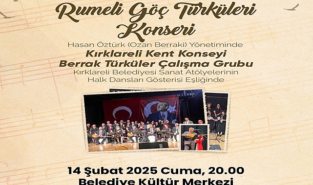 Kırklareli Belediyesi, Kent Konseyi ile iş birliği içinde düzenlediği özel bir etkinlik ile Kırklareli halkını buluşturuyor. Bu akşam saat 20.00’de Kültür Merkezinde gerçekleştirilecek olan "Rumeli Göç Türküleri Konseri", Hasan Öztürk (Ozan Berraki) yönetiminde ve Kent Konseyi Berrak Türküler Çalışma Grubu’nun katkılarıyla sahne alacak. Konserde, belediyemiz Sanat Atölyeleri Halk Dansları gösterisi de izleyicilerle buluşacak.