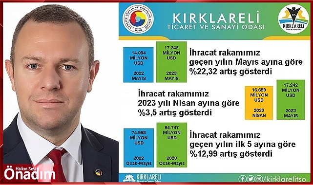 “Kırklareli merkezli firmalar 2023 Mayıs ayında 17.242 milyon dolar ihracat rakamına ulaştı. 2023 yılı Mayıs ayında ilimizden yapılan İhracat 2023 yılı Nisan ayına göre yüzde 3,5 artış, 2022 yılının Mayıs ayına göre ise de yüzde 22,32 artış gösterdi. 2023 yılının ilk 5 ayında Kırklareli’nden yapılan ihracat rakamı toplamı 84.747 milyon dolara yükselerek, 2022 yılının ilk 5 ayına kıyasla yüzde 12,99’luk bir artış gösterdi.