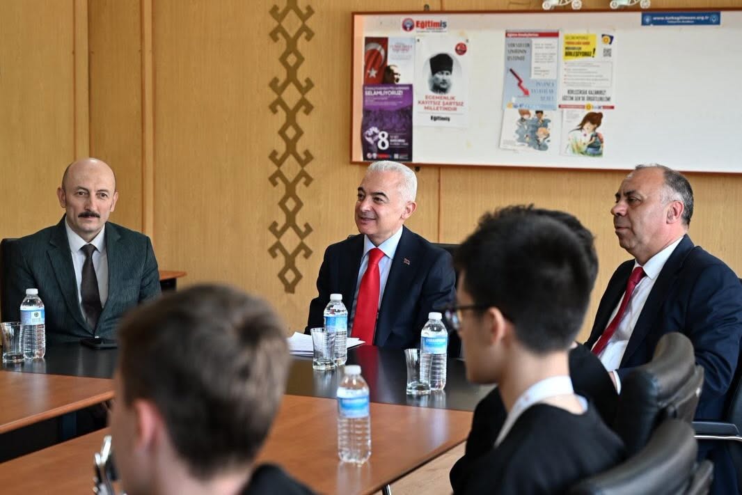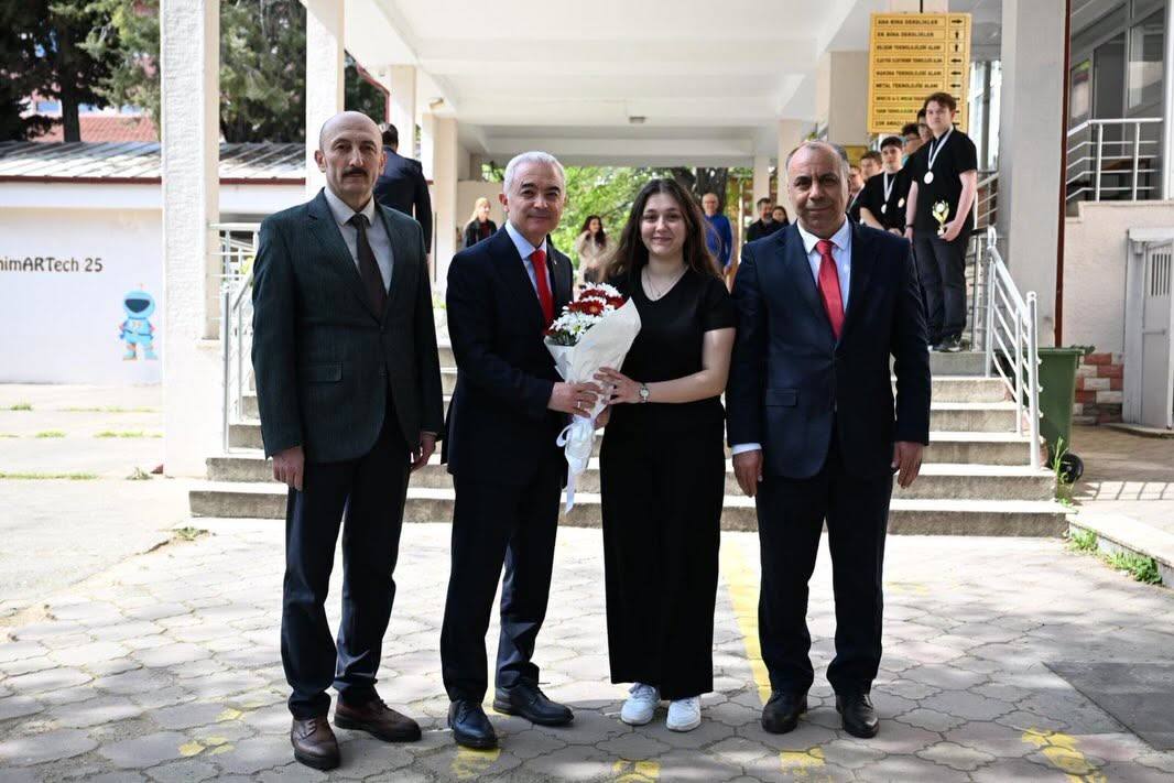 Vali Uğur Turan, İl Millî Eğitim Müdürü Murat Altınöz ile birlikte okulu ziyaret ederek, uluslararası alanda şampiyonluk kupasını kaldıran öğrencilerle bir araya geldi. Ziyaret kapsamında dünya şampiyonu projeleri yerinde inceleyen Vali Turan, çalışmaların teknik altyapısı ve hazırlık süreçleri hakkında öğretmen ve öğrencilerden detaylı bilgi aldı.