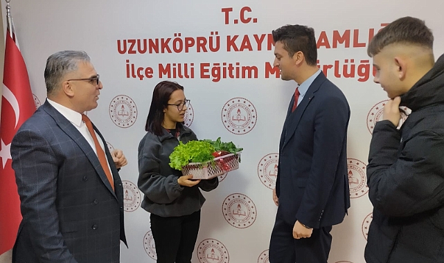 Edirne'nin Uzunköprü ilçesindeki Mimar Muslihiddin Mesleki ve Teknik Anadolu Lisesi (MTAL) tarım bölümü öğrencileri, dikkat çekici bir projeyle gündeme geldi. Okulun seralarında özenle yetiştirdikleri organik ürünleri, İlçe Milli Eğitim Müdürü Koray Kurtar'a sunarak tarım yeteneklerini sergileyen öğrenciler, büyük takdir topladı. İlçe Milli Eğitim Müdürü Koray Kurtar, bu başarılı çalışmadan dolayı öğrencileri tebrik ederek, "Bu tarz projeler, gençlerin yeteneklerini geliştirmeleri ve mesleki eğitimlerini pekiştirmeleri açısından büyük önem taşıyor," dedi. Mimar Muslihiddin MTAL tarım bölümü öğretmenleri ve öğrencileri, tarımın geleceği ve organik üretimin yaygınlaştırılması için çalışmalarına devam edeceklerini açıkladı. Bu tür etkinliklerin, öğrencilerin eğitim süreçlerini zenginleştirerek onları geleceğe daha donanımlı bir şekilde hazırlamayı amaçladığını belirttiler.Furkan Onur Öztaş